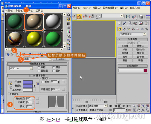 選擇一個缺省的材質球,將其賦予物體,并命名為"抽屜",如圖2-2-19所示。