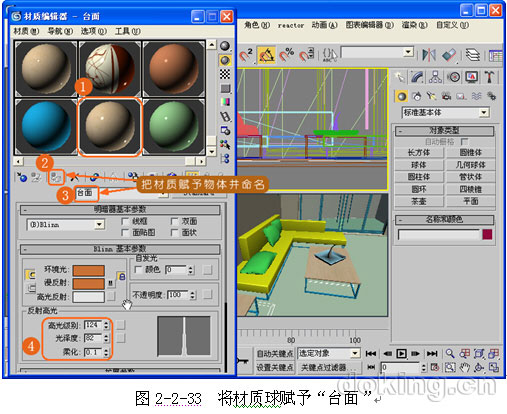 選擇一個缺省的材質球,將其賦予"臺面"物體并命名為"臺面",如圖2-2-33所示。