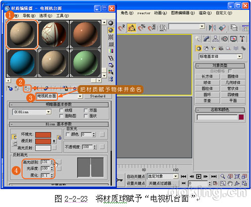 選擇一個缺省的材質球,將其賦予"電視機臺面"物體并命名為"電視機臺面",如圖2-2-23所示。