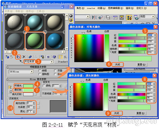 設置它的漫反射色和環境色,具體操作步驟與參數設置如圖2-2-11所示。