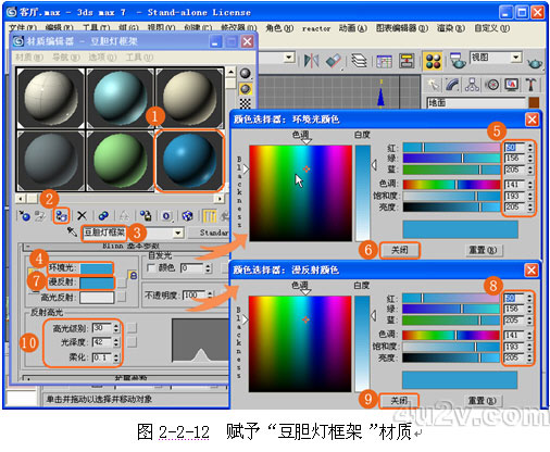 設置它的漫反射色和環境色,具體操作步驟與參數設置如圖2-2-12所示。