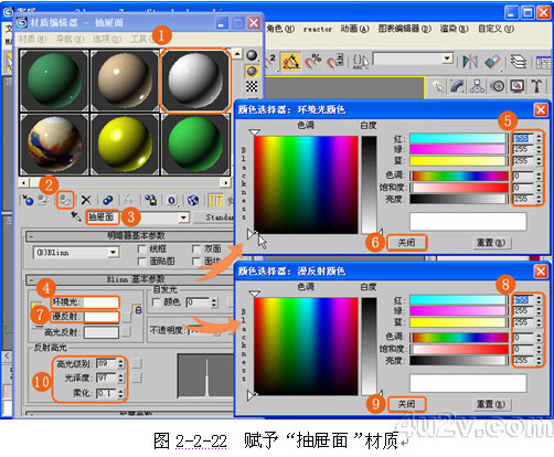 設置它的漫反射色和環境色,具體操作步驟與參數設置如圖2-2-22所示。
