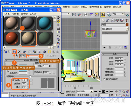 選擇一個缺省的材質球,并把材質球賦予物體,并命名為"裝飾板",如圖2-2-14所示。