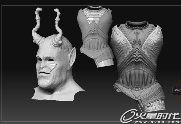 在zbrush里面我導入之前做好的低面人物,進行多次細分,逐步雕刻。zb最大的優(yōu)勢在于整體的把握,即便是一些小小的皺紋都能雕刻出來,這就要求對模型的理解能力以及自己的造型能力。在導入之前檢查一下uv是否合理。逐步把盔甲的紋理表現(xiàn)出來,使形體逐漸完善。