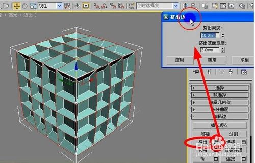 4、在右下角的修改面板選擇“擠出”,點(diǎn)擊擠出的后面的修改選項,彈出對話框。