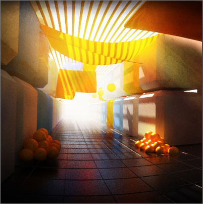 我需要強烈的日光從屋頂射下來,表現出美麗的光束,而且帶有復合的陰影。同時,我想要某一條街明亮一點,表達炎熱以及平和的感覺。其他的就要暗一點,陰暗,涼快,有點點濕氣。這些東西呢,可以用v-ray sun, v-ray sky,一些本地燈源的區域光,許多gi和一些能產生不錯的光發散的指數色彩映射。