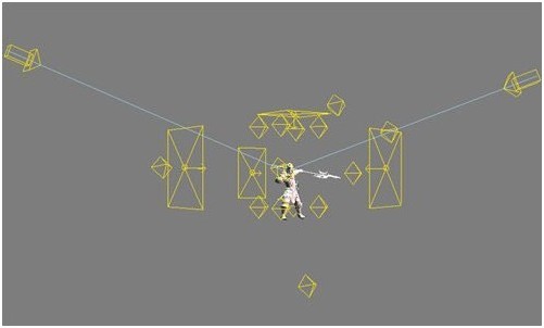 照明方面,我用了13個泛光燈照明,2直線燈照明和4個Vray光照。這個點(diǎn)是燈的位置設(shè)置。(圖5&圖6)