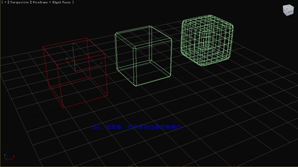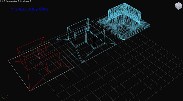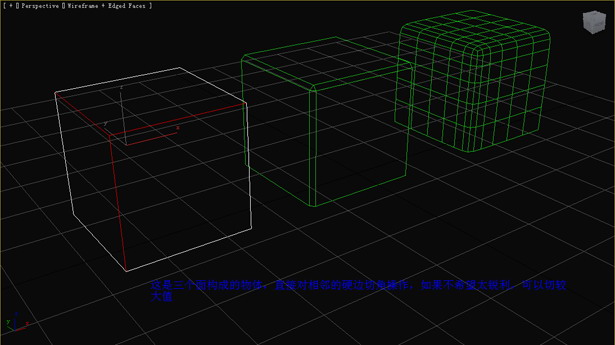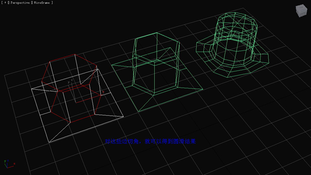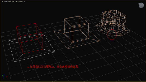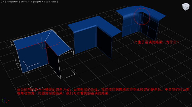 首先說明這是一個錯誤的切角方式。如圖形狀的物體(右邊第一個),我們依然想圓滑后得到比較好的硬角邊,于是我們對硬角邊切角,而圓滑后的結(jié)果,我們可以看到錯誤的結(jié)果。(圖04)