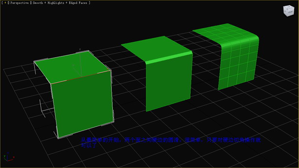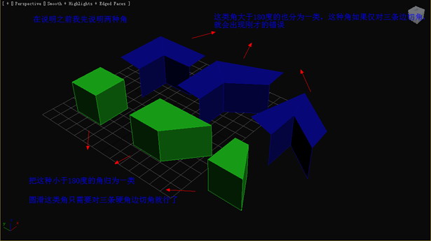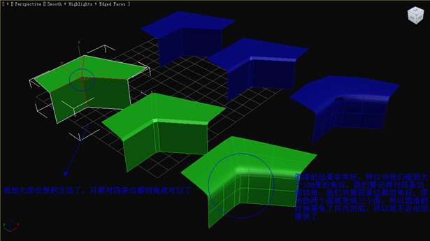 我們舉個例子,看藍色模型,這是大于180的角,如果我們僅切三條邊的話,圓滑后出錯了。綠色模型是小于180的角,切了三條邊后,圓滑的很不錯。(圖07)