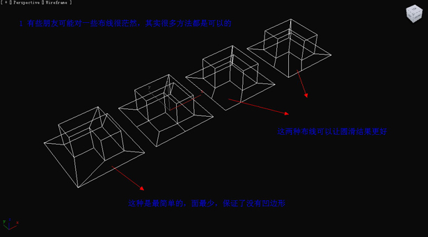 有些朋友可能對一些布線很茫然,其實很多方法都是可以的。我們看第一個圖形,這種是最簡單的,面最少,保證了沒有凹邊形。后兩種布線可以讓圓滑結(jié)果更好。(圖23)