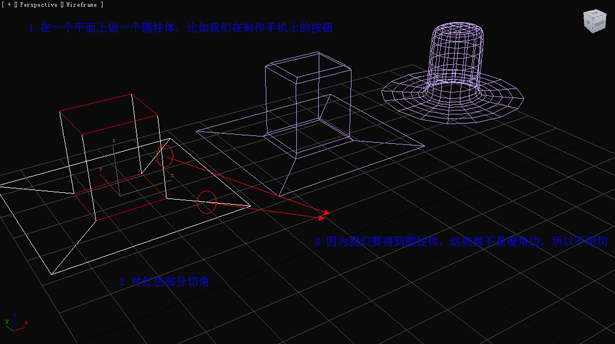 在一個平面上做一個圓柱體,比如我們在制作手機上的按鈕。對紅色部分切角,因為我們要得到圓柱體,這些都不是硬角邊,所以不用切。(圖18)