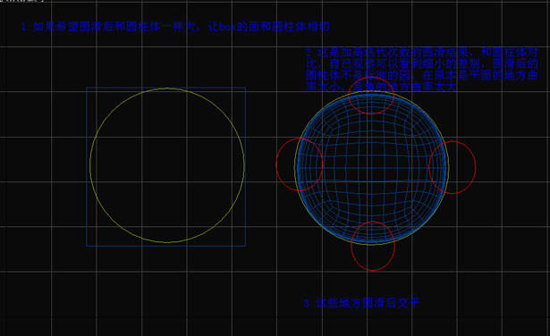 如果希望圓滑后和圓柱體一樣大,就讓Box的面和圓柱體相切,可以看第一個圖形。再看第二個,這是加高迭代次數(shù)的圓滑結(jié)果,和圓柱體對比,自己觀察可以看到細小的差別,圓滑后的圓柱體不是標(biāo)準(zhǔn)的園,在原本是平面的地方曲率太小,是角的地方曲率太大。可以看到紅圈的地方,這些地方圓滑后交平。(圖15)