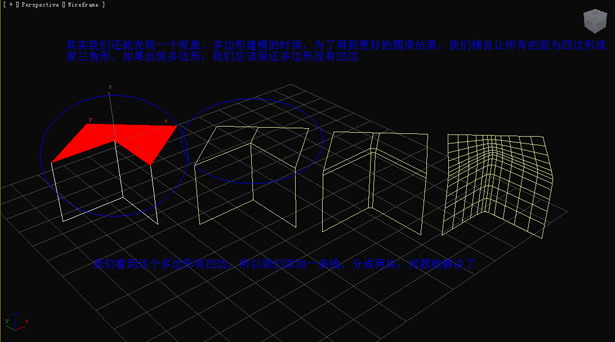 其實我們還能發(fā)現(xiàn)一個現(xiàn)象,多邊形建模的時候,為了得到更好的圓滑結(jié)果,我們盡量讓所有的面為四邊形或者三角形。如果出現(xiàn)多邊形,我們應(yīng)該保證多邊形沒有凹邊。我們可以從圖中第一個圖形中看到這個多邊形有凹邊,所以我們添加一條線,分成兩塊,問題就解決了。(圖10)