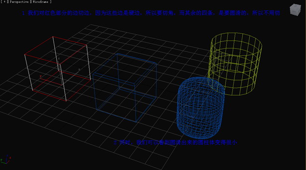 我們對紅色部分的邊切邊,因為這些邊是硬邊,所以要切角,而其余的四條,是要圓滑的,所以不用切。同時,我們可以看到圓滑出來的圓柱體變得很小。(圖14)