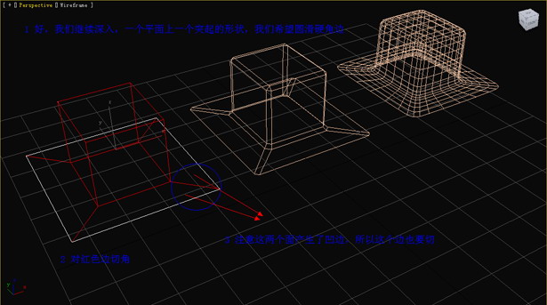 好,我們繼續(xù)深入,一個平面上一個突起的形狀,我們希望圓滑硬角邊。對紅色邊切角。要注意下面兩個面產(chǎn)生了凹邊,所以這個邊也要切。(圖11)