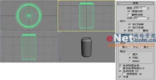 2、選中line01,單擊“修改”按鈕進入其命令面板,在修改器下拉列表中選擇“車削”項,進入其屬性面板,修改其參數,單擊“對齊”欄下的“最大”按鈕,旋轉后的圖形如圖2所示。