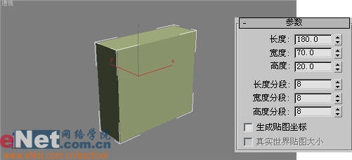 1、啟動3dmax9.0,單擊“創建”命令面板,點擊“幾何體”按鈕,在下拉列表框中選擇“標準基本體”項。單擊“長方體”按鈕,在視圖中繪制一長方體box01,并修改其參數,如圖1所示。
