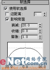 2、選中box01,點擊“修改”命令面板,在“修改器列表”下拉框中選擇“編輯網格”項,進入其選擇面板,點擊“頂點”按鈕,展開“軟選擇”卷展欄,修改其參數,如圖2所示。