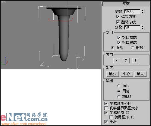 2、選中Line01,單擊“修改”命令面板,在“修改器列表”下拉框中選擇“車削”項(xiàng)進(jìn)入其屬性面板修改相關(guān)參數(shù),得到的效果如圖2所示。