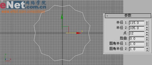 1、啟動3dmax9.0,單擊“創建”命令面板,點擊“圖形”按鈕進入其創建圖形命令面板,點擊“星形”按鈕,在頂部視圖中繪制一星形Star01,進行參數定義,如圖1所示。