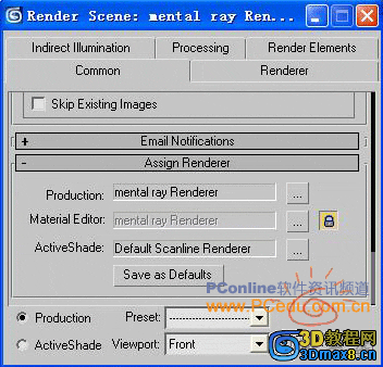 單擊工具欄上的Render Scene Dialog工具打開渲染設置對話框,將渲染器指定為Mental Ray渲染器,如圖1-2所示。此時渲染對話框中的標簽面板共有5個, mental ray渲染器的Common和Render Elements命令面板內的參數大部分與默認的掃描線渲染器的對應參數一致,這里我們只介紹其Mental Ray渲染器所特有的參數。