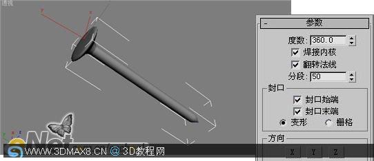2、單擊“修改”命令面板,在“修改器列表”下拉框中選擇“車削”項,產生旋轉實體,打開“參數”卷展欄,調整方向,修改后效果如圖2所示。