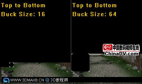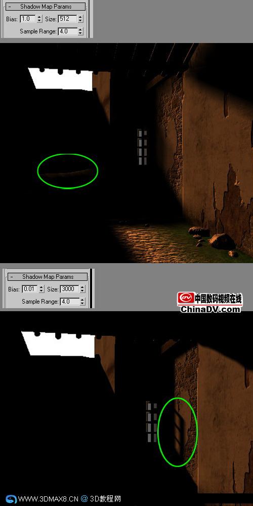 燈光面版Shadow Map Params下,左圖Bias值為1.0, Size值為512