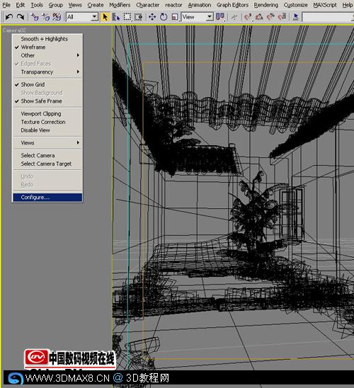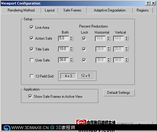 4.在視窗左上角 Camera 字上單擊鼠標(biāo)右鍵在彈出的菜單下選擇 Configure…會(huì)彈出個(gè)Viewport Configuration面版 Safe Frames(渲染安全框設(shè)置) Live Area 渲染安全框最外面的線框,Action Safe 是渲染安全框中間的線框,Title Safe渲染安全框最里面的線框。
