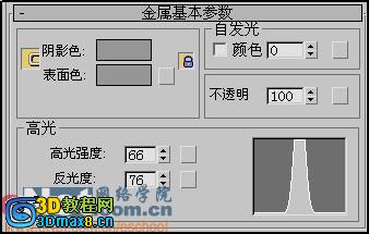 4、展開材質編輯器中的“金屬基本參數”卷展欄,按圖05所示修改參數。