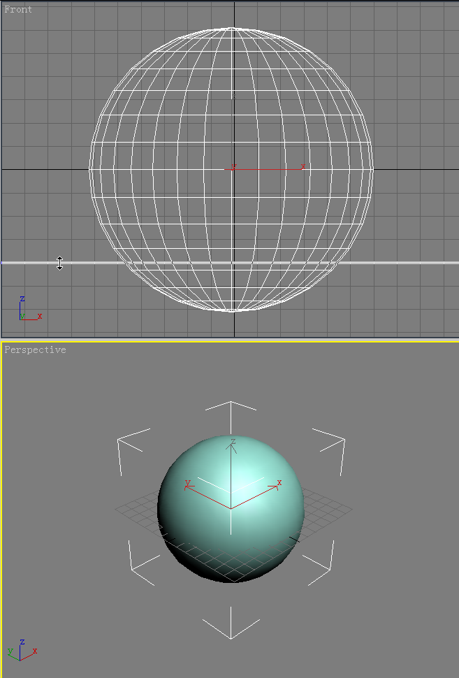 1. 繼續前面的練習,或者打開保存的文件。將光標移動到透視視口和前視口的中間,見圖1.11,這時出現一個雙箭頭光標。