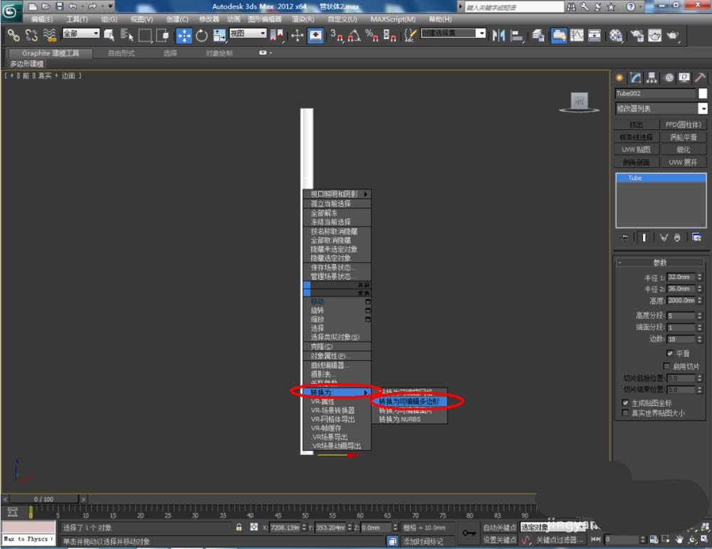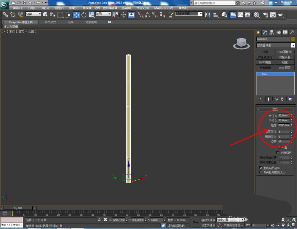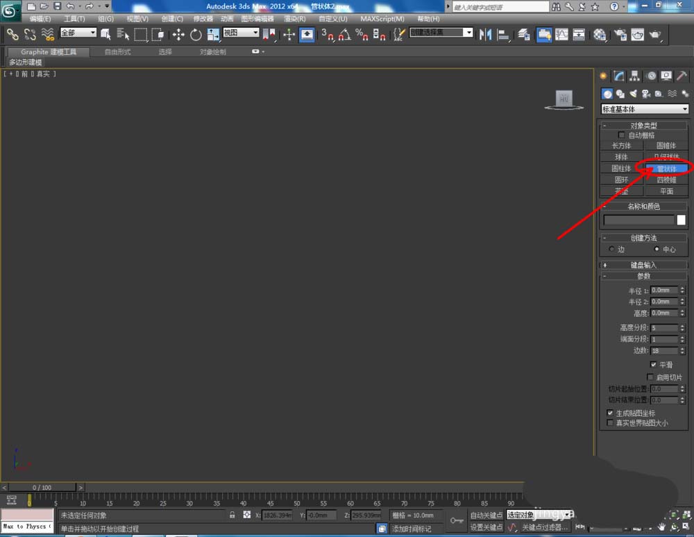 1、打開3Dmax2012軟件,點擊【幾何體】-【管狀體】,在作圖區域繪制一個管狀體模型(模型參數如圖所示),并將模型對象顏色設置為白色;