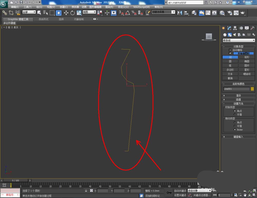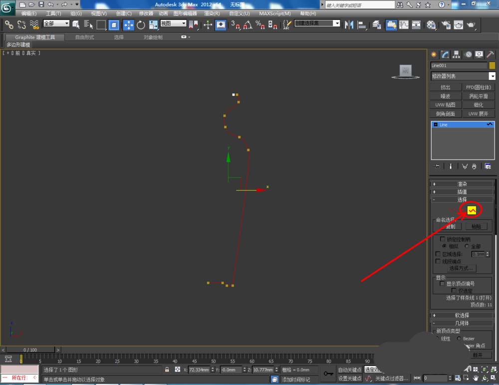 1、打開3Dmax2012軟件,點擊【創建】-【圖形】-【線】,在繪圖區域繪制出瓶子的剖面線條。點擊右邊工作區中的【點】圖標,對圖案的點進行調整(如圖所示);