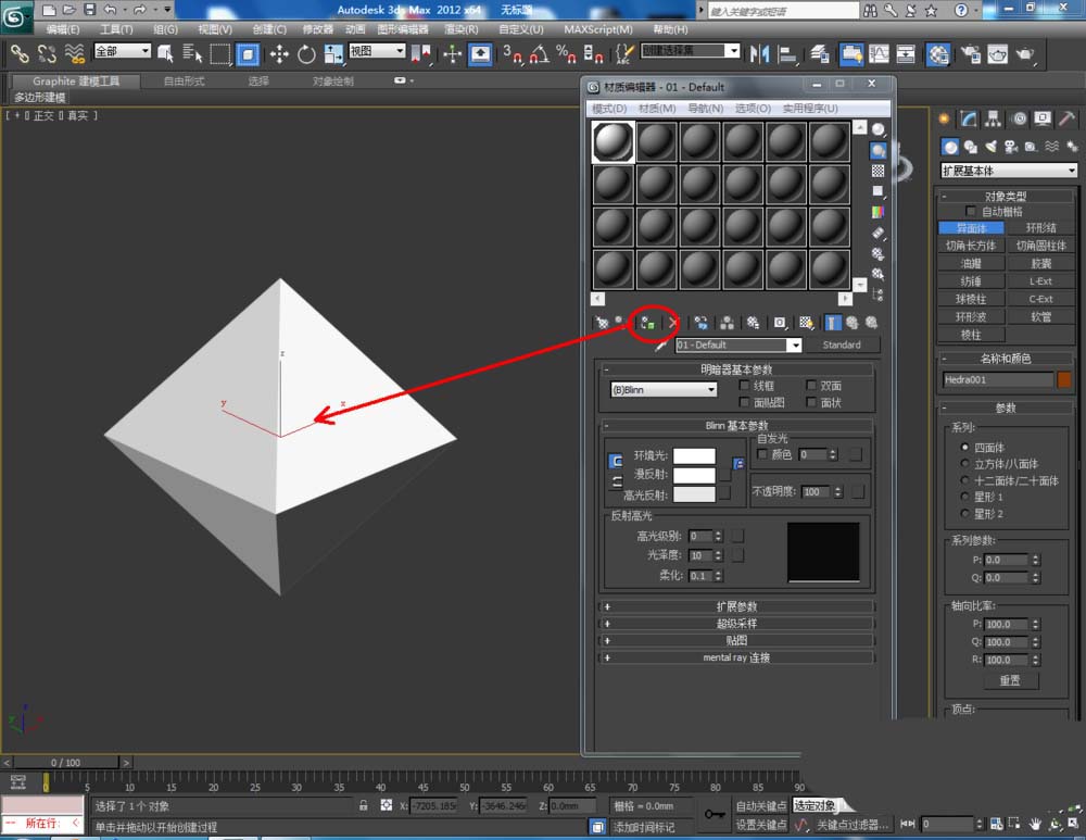 1、打開3Dmax2012軟件,點(diǎn)擊【創(chuàng)建】-【幾何體】-【擴(kuò)展基本體】-【異面體】,勾選四面體后,在作圖區(qū)域繪制一個基本體模型(如圖所示);