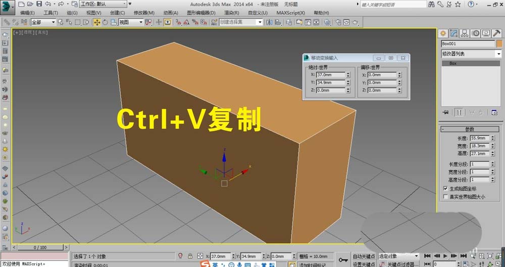 5、舉個例子說明一下,在當前位置復制一個長方體,并在相對坐標的各個表格里面填寫100mm,此時我們會發現被復制的對象,相對原對象坐標值X,Y,Z都是100mm,此時單獨來看復制對象,它的絕對坐標值比原對象坐標值都增加了100mm。