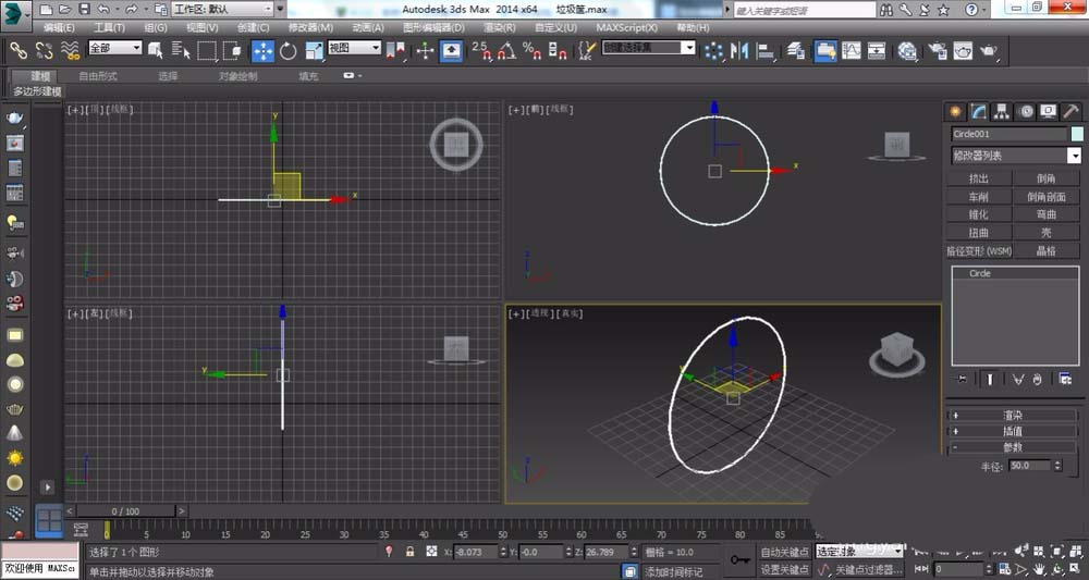 1、打開3DSMAX繪圖軟件,先在前視圖繪制一個正圓,半徑為50毫米,如下面圖紙所示。