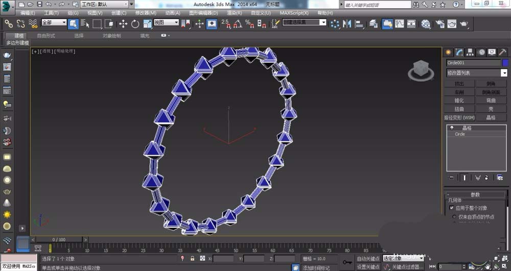 4、選擇正圓,點擊晶格修改器按鈕,在幾何體部分勾選應用于整個對象,再勾選二者,如下圖所示。