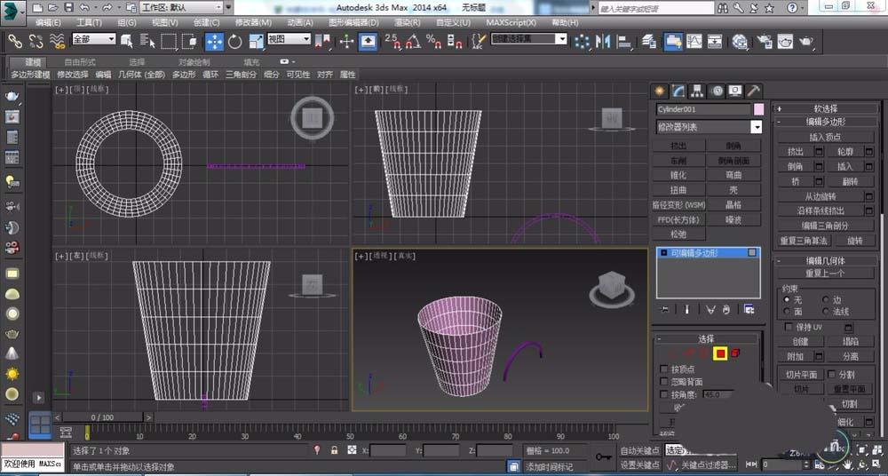 5、選擇圓柱體,把它轉變成可編輯多邊形,選擇最上面的面并刪除掉,如下面效果圖所示。