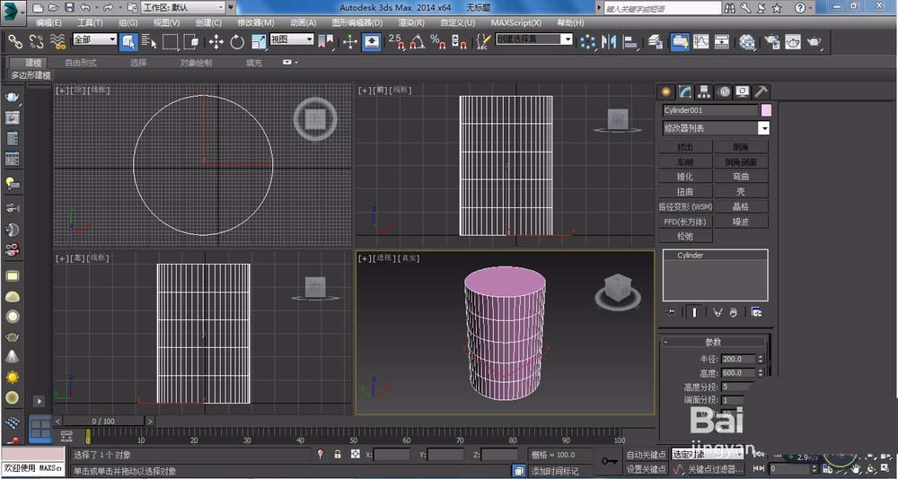 1、現在頂視圖創建一個圓柱體,半徑設為200mm,高度600mm,邊數50,其余保持不變,如下圖所示。