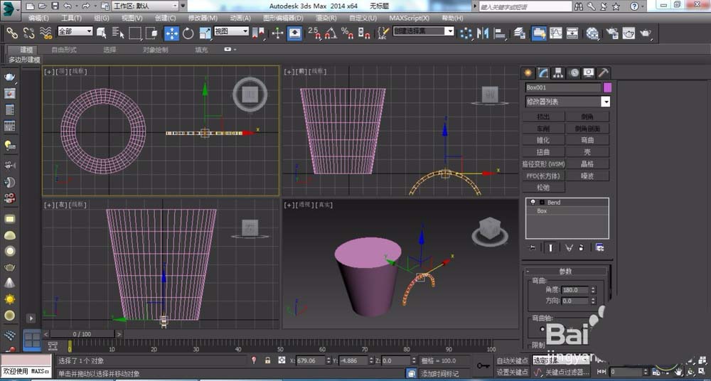 4、選擇長方體,點擊彎曲修改器,彎曲軸選擇X軸,彎曲180度,具體效果如下圖所示。
