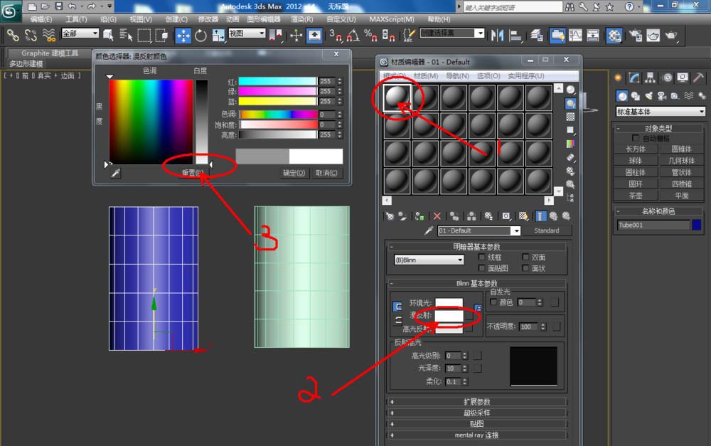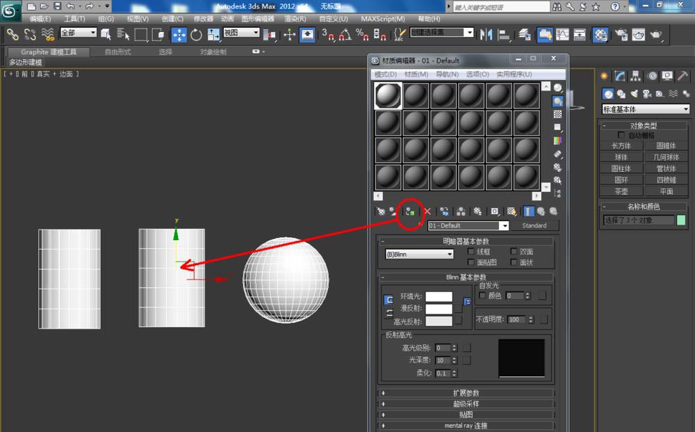 2、選中三個模型,點擊【材質編輯器】,彈出材質編輯器設置欄,設置一個白色材質球并附加給所有模型。完成后,點擊【對象顏色】,將模型的對象顏色設置為黑色;