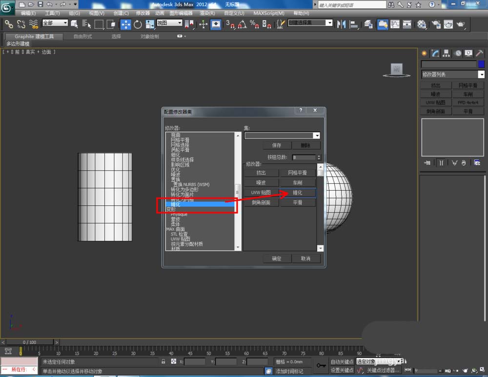 3、點擊【配置修改器集】,彈出配置修改器集選項欄,找到【錐化】,并將其拉動至右邊選項欄中,點擊【確定】將【錐化】功能調出到工作區界面(如圖所示);