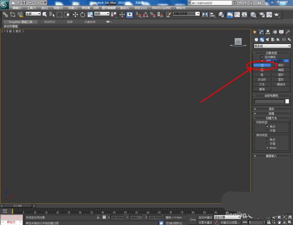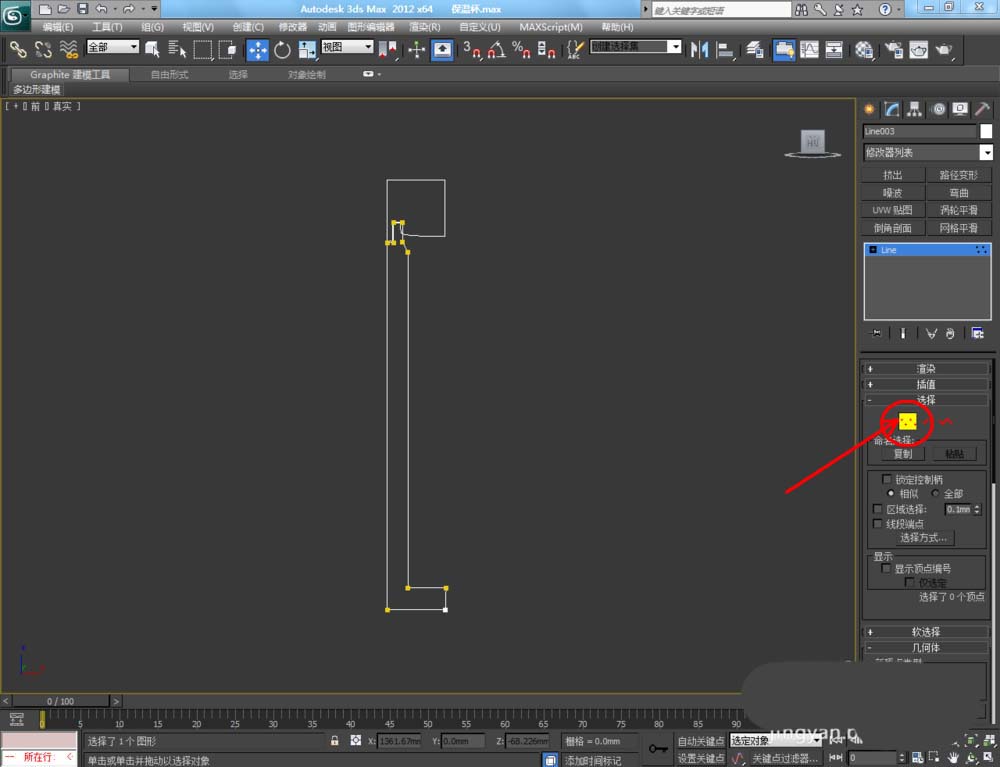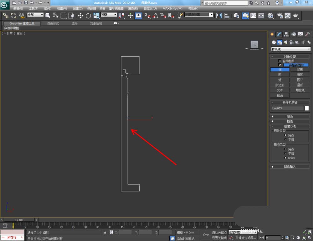 1、打開3Dmax2012軟件,點擊【創建】-【圖形】-【線】,在作圖區域繪制一個多邊圖案。點擊右邊工作區中的【頂點】,對圖示圖案上的點進行圓化處理,制作出保溫瓶蓋的截面圖案;
