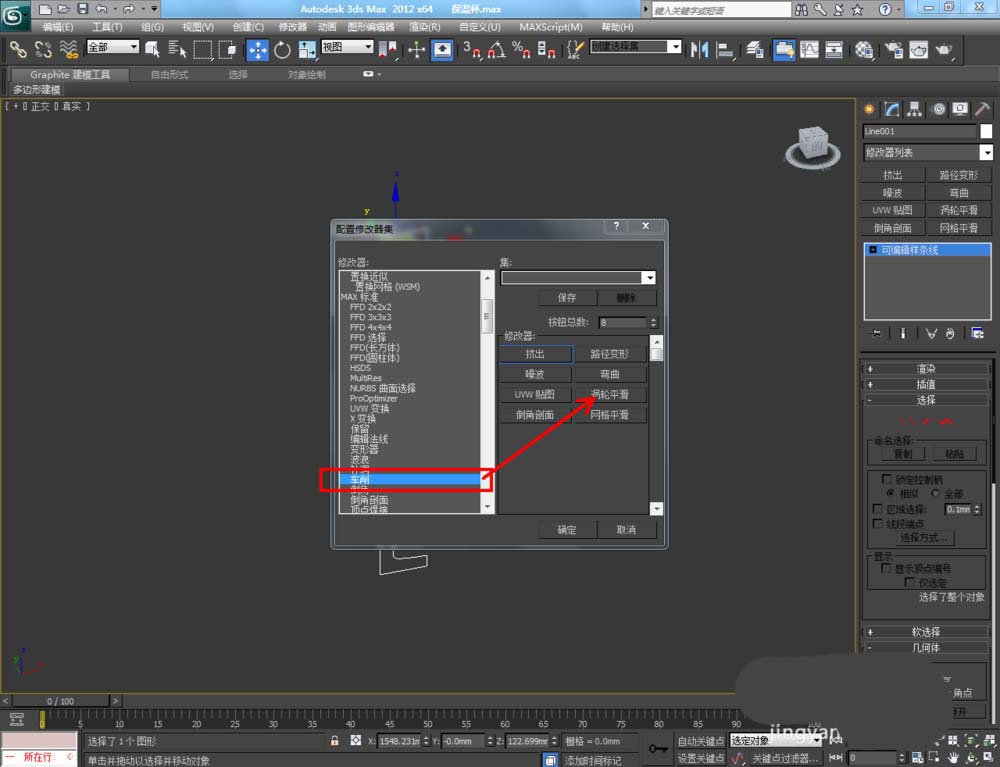 3、點擊【修改】-【配置修改器集】,彈出配置修改器集選項欄,找到【車削】并將其拉動到右邊的選項欄中,點擊【確定】將車削調出;