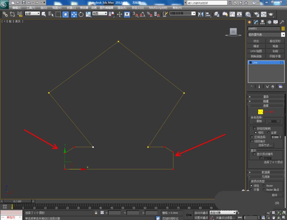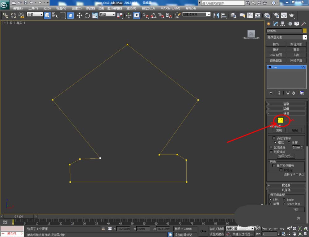 1、打開3Dmax2012軟件,點擊【創建】-【圖形】-【線】,在作圖區域繪制一個多邊形圖案(如圖所示);