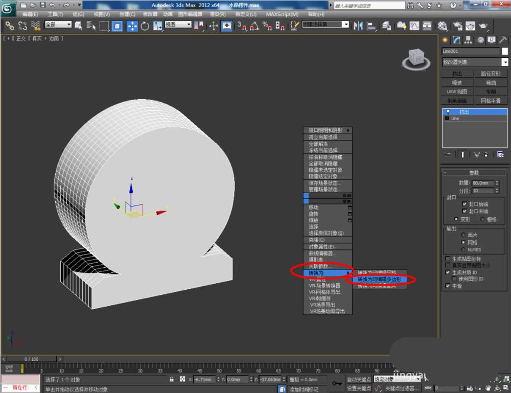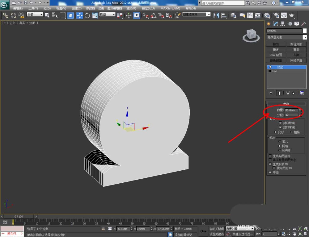 3、選中圖案,點擊【修改】-【擠出】,擠出數量設置為:80mm,分段設置為:10制作出擺件基本模型。選中模型,點擊鼠標右鍵-【轉換為】-【轉換為可編輯多邊形】。點擊【邊】圖標,選中圖示模型上的邊后,點擊【切角】進行切角處理(如圖所示);