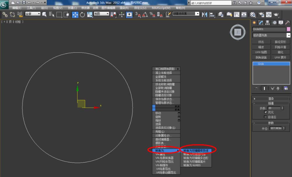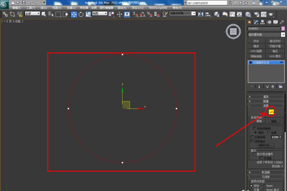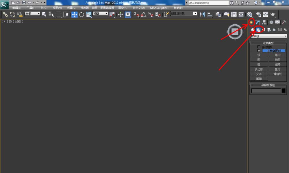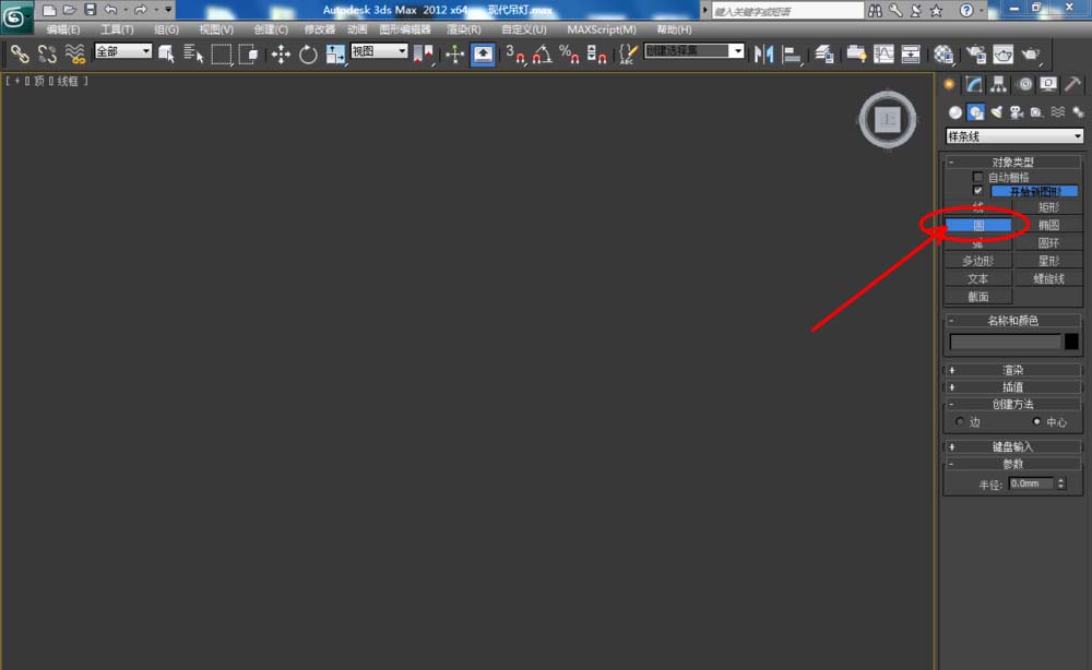 1、打開3Dmax2012軟件,點擊【創建】-【圖形】-【圓形】,在作圖區域繪制一個圓形圖案并按圖示設置好圓形圖案的各個參數;