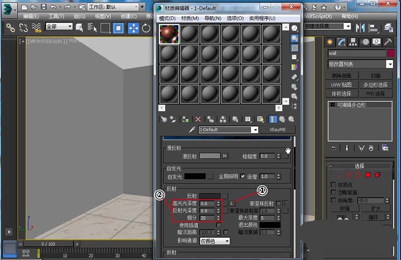 5、解鎖“反射光澤度”和“高光光澤度”。“高光光澤度”設置為0.6,“反射光澤度”設置為0.9,細分20。