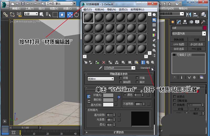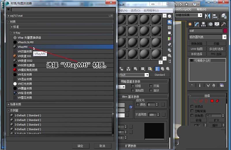 2、按M打開“材質編輯器”,單擊“Standard”,打開“材質/貼圖瀏覽器”,選擇“VRayMtl”材質。把“Standard”轉換成“VRayMtl”。