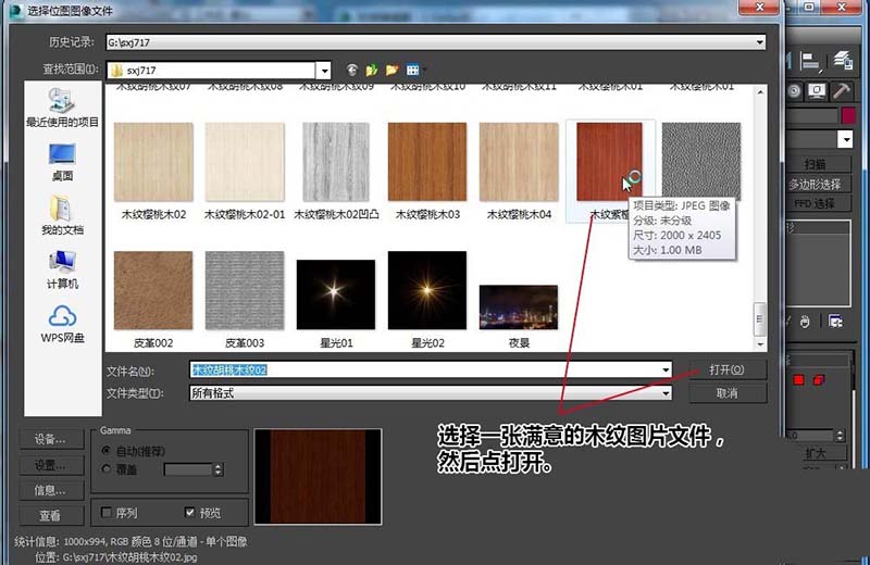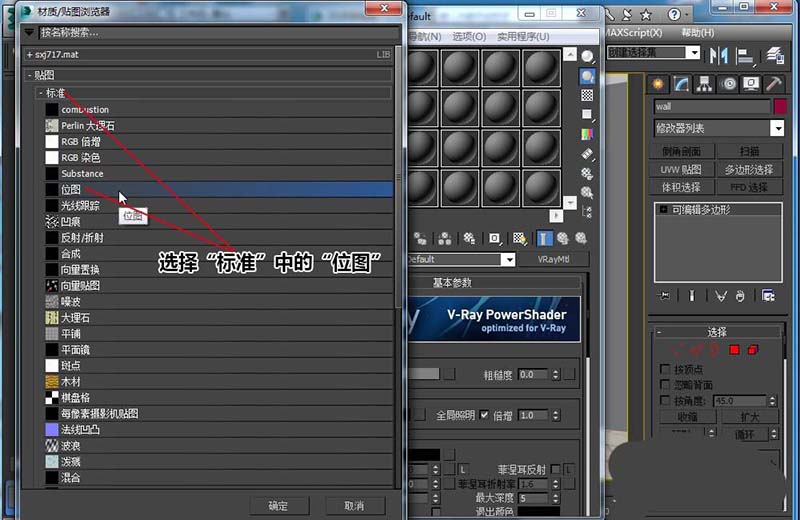 3、單擊“漫反射”貼圖按鈕,打開“材質/貼圖瀏覽器”,選擇“標準”中的“位圖”,在彈出的“選擇位圖圖像文件”對話框中,在自己的電腦選擇一張滿意的木紋圖片文件,然后點打開。