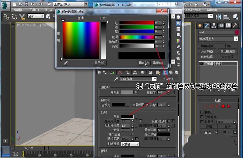 4、把“反射”的顏色改為亮度為40的灰色,在“反射”中,黑色表示完全不反射,白色表示最強的反射,即鏡面。